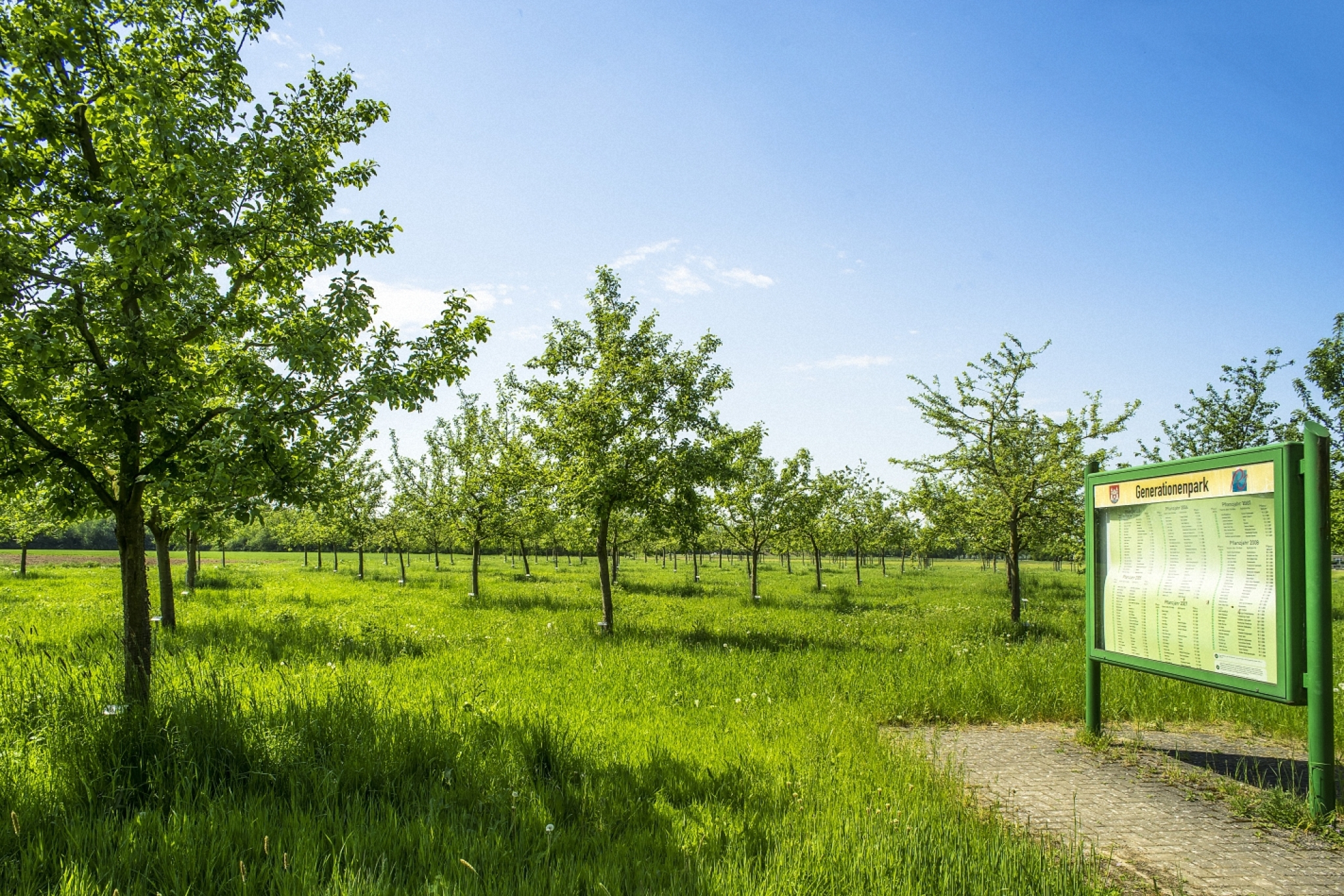 Auf dem Gelände des Generationenparks wurde eine Informationsvitrine aufgestellt. In dieser Vitrine sind Pläne eingebracht, auf denen der Standort "Ihres" Baumes kenntlich gemacht wird. Dazu wird auch der Name Ihres Kindes aufgeführt und die Bezeichnung des Apfelbaumes hinzugefügt.
