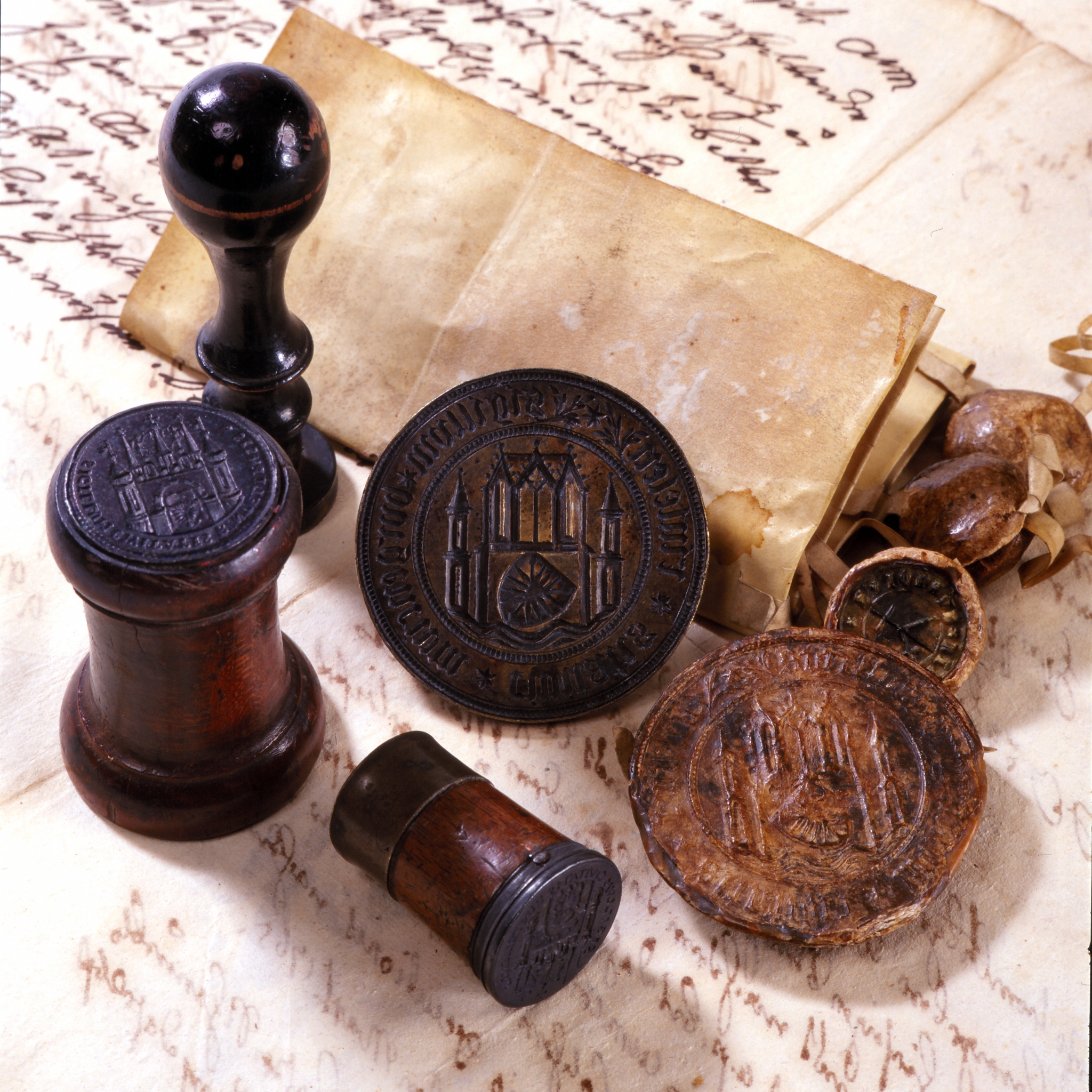 Stempel und Siegel: Städtische Siegel seit dem 15. Jahrhundert, Siegel der Zünfte seit dem 17. Jahrhundert, Stempel und Amtssiegel aus den eingemeindeten Ortschaften.