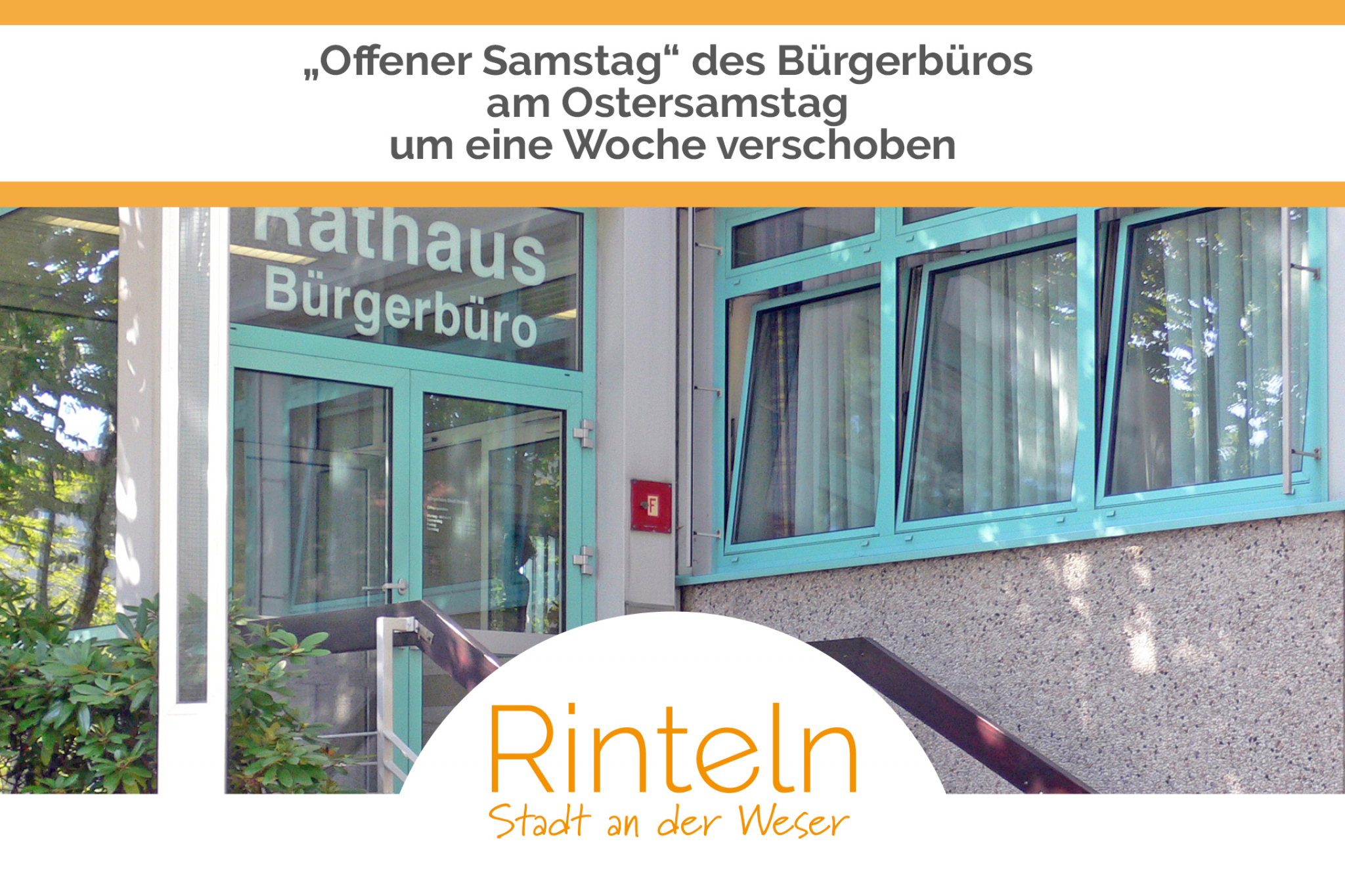 Die Stadt Rinteln teilt mit, dass der offene Samstag im Bürgerbüro am Ostersamstag ausnahmsweise wegen der Feiertage vom 03.04.2021 auf den 10.04.2021 verschoben wird.
