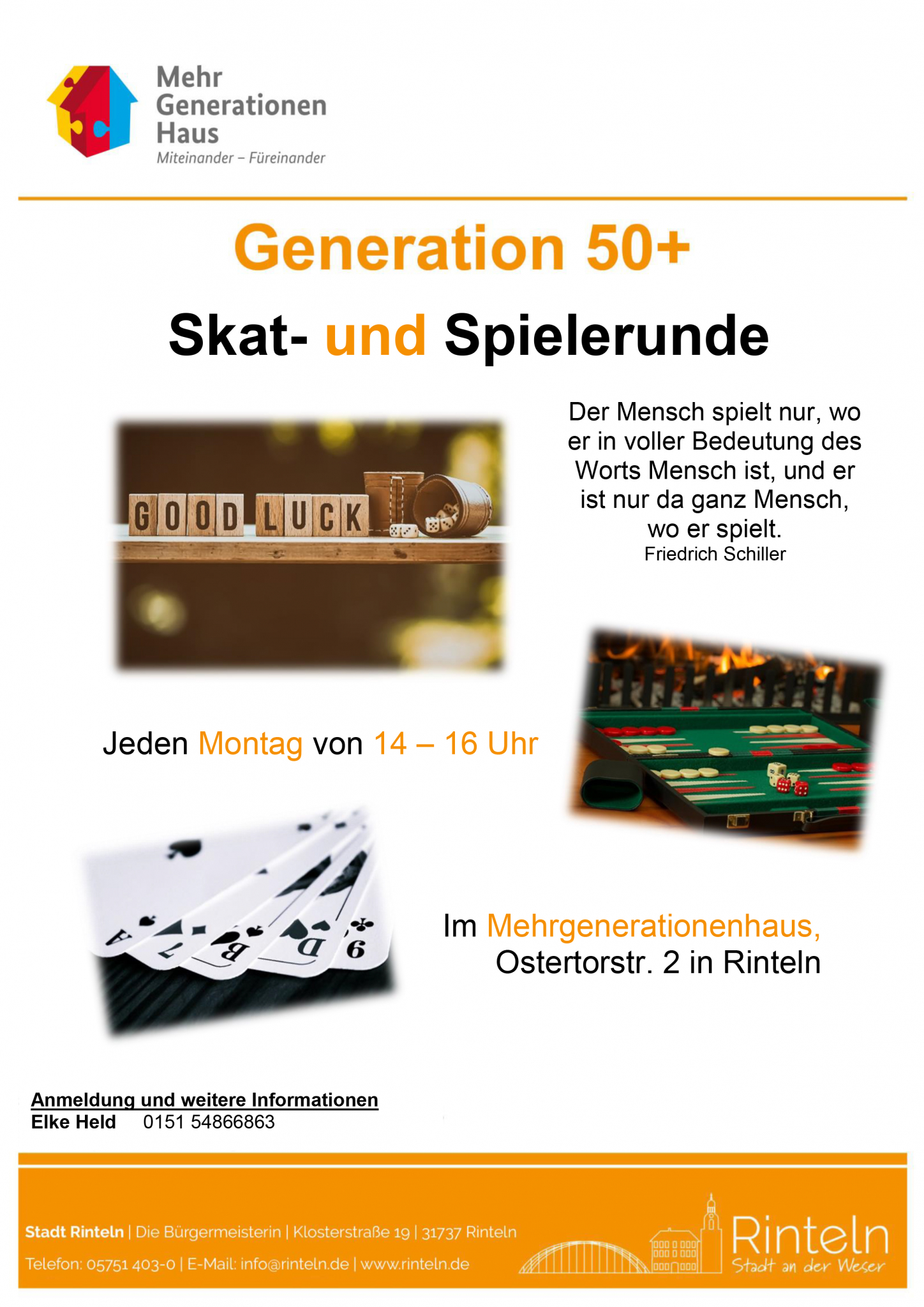 Ab Montag, dem 25.04.2022 lädt das Team der „Generation 50+“ regelmäßig zur wöchentlichen Skat- und Spielerunde in das Mehrgenerationenhaus ein. Ob Karten- oder Brettspiel, hier ist für alle etwas dabei!