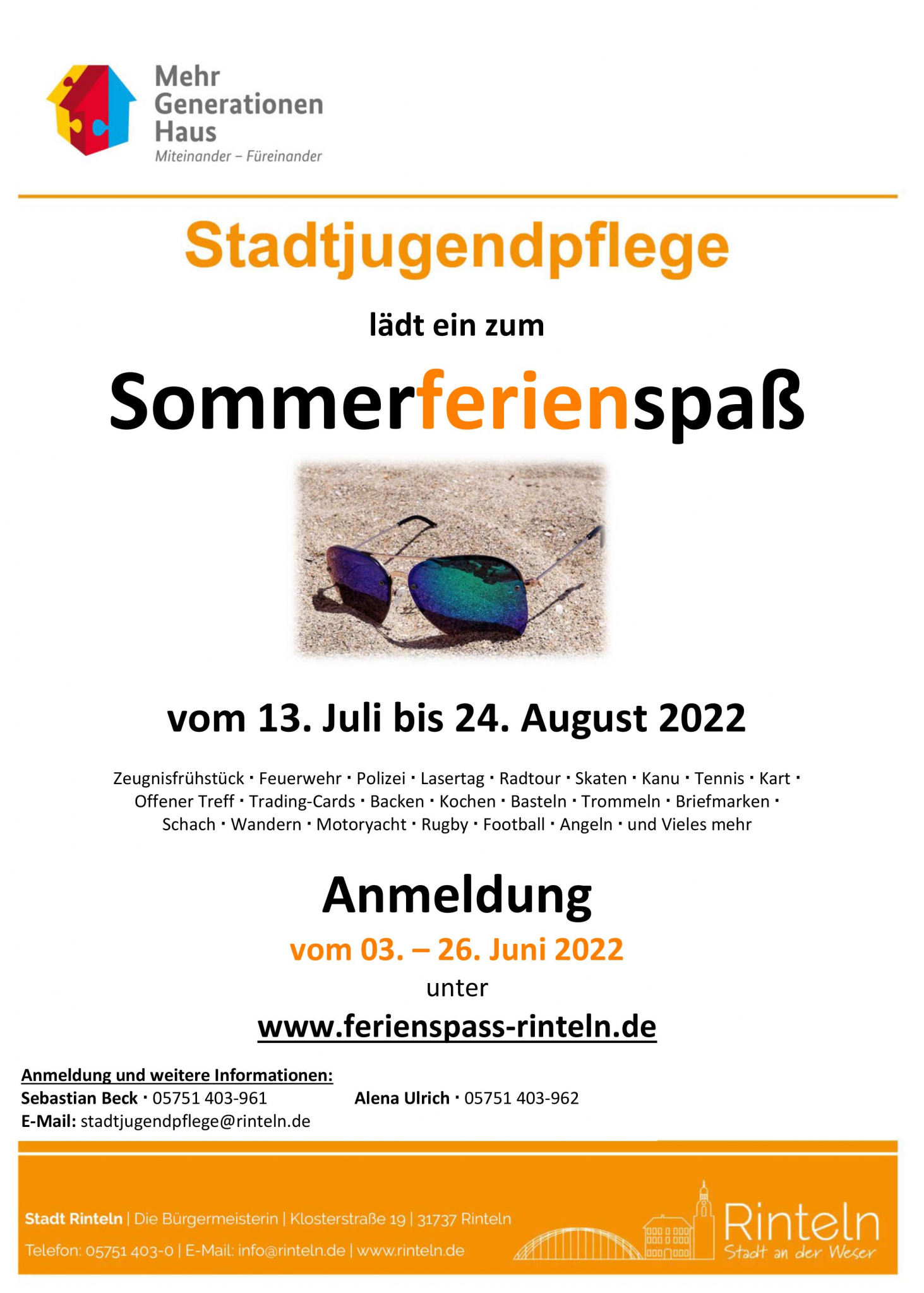 Sommer, Sonne, Langeweile? Garantiert nicht in Rinteln! Der Sommerferienspaß der Stadt Rinteln lässt in der schulfreien Zeit keine Langeweile aufkommen! Über den Zeitraum der gesamten Sommerferien gibt es ein abwechslungsreiches Programm, gefüllt mit jeder Menge Spiel, Spaß und Aktionen. Von Sportangeboten über Ausflüge – z.B. ins Rasti-Land oder in den Movie-Park – über Basteln, Kochen und Spielen ist für jede Altersgruppe etwas Passendes dabei.