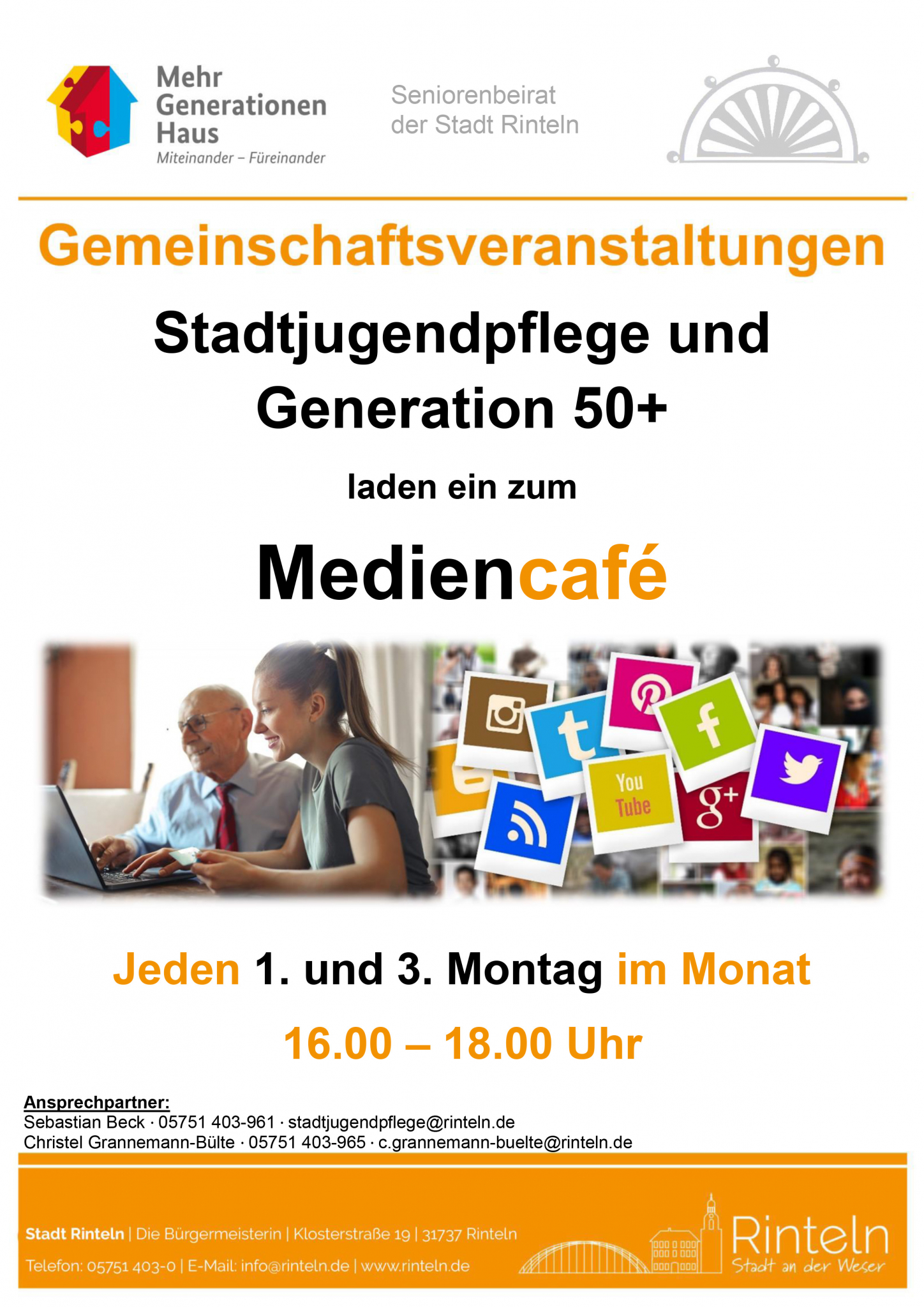 Die Stadtjugendpflege und das Team der Generation 50+, begleitet durch die Stiftung für Rinteln, haben mit dem Mediencafé einen Rahmen geschaffen, in dem in entspannter Atmosphäre bei einer Tasse Kaffee alle Fragen rund um die Handynutzung, Kurznachrichtendienste, Internetzugänge und vieles mehr geklärt werden können. Dabei ist es unerheblich, ob jemand schon Erfahrungen mit den Medien und nur spezielle Fragen hat oder ob sich jemand erst neu mit dieser Technik auseinandersetzen möchte. Alle Fragen werden individuell geklärt. Die jungen Menschen, die mit dieser Technik groß geworden sind, teilen ihr Wissen gern mit der Generation 50+.