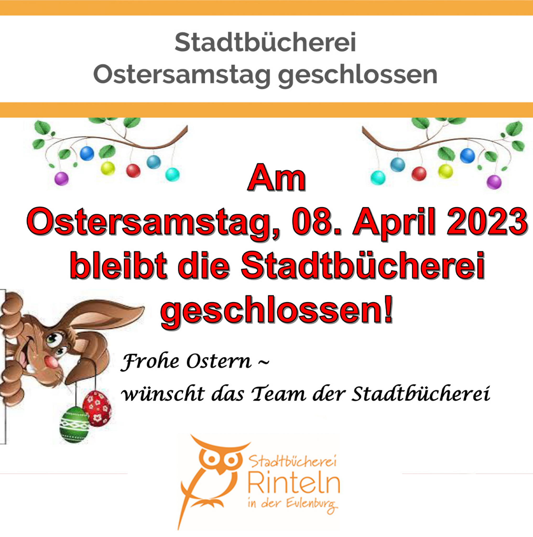 Die Stadtbücherei bleibt am Ostersamstag, 08. April 2023, geschlossen.