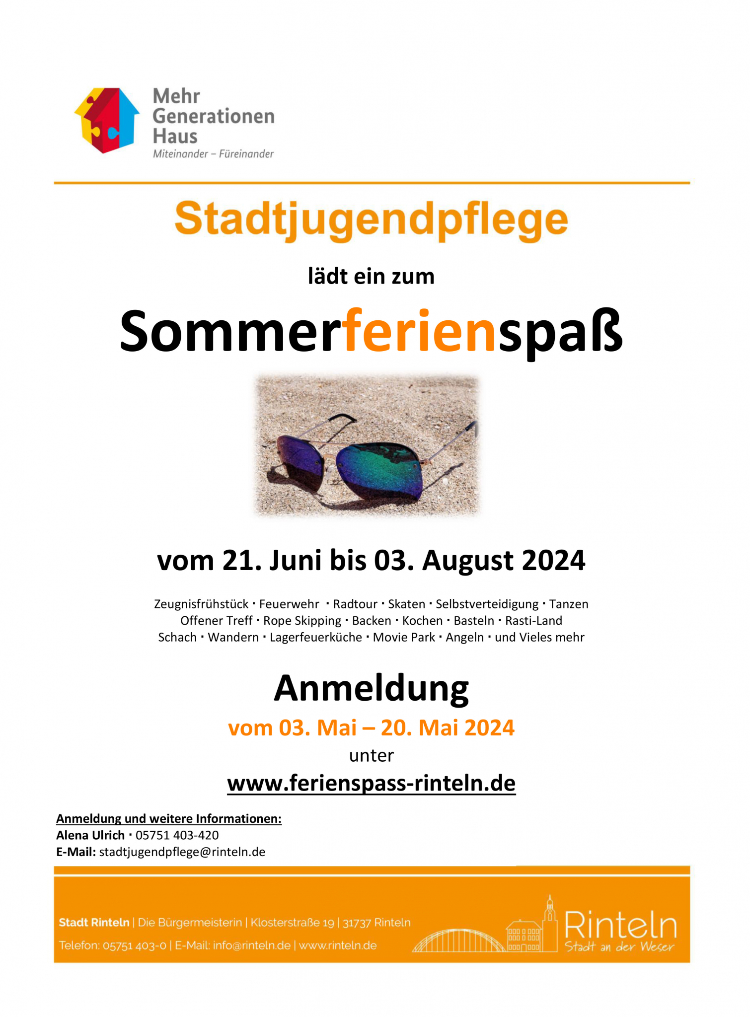 Sommer, Sonne, Langeweile? Garantiert nicht in Rinteln! Der Sommerferienspaß der Stadt Rinteln lässt in der schulfreien Zeit keine Langeweile aufkommen. Die ganzen Sommerferien lang gibt es ein abwechslungsreiches Programm gefüllt mit jeder Menge Spiel, Spaß und Aktionen. Von Sportangeboten über Ausflüge – z. B. ins Rastiland oder in den Moviepark – über Basteln, Kochen und Spielen ist für jede Altersgruppe etwas Passendes dabei.
