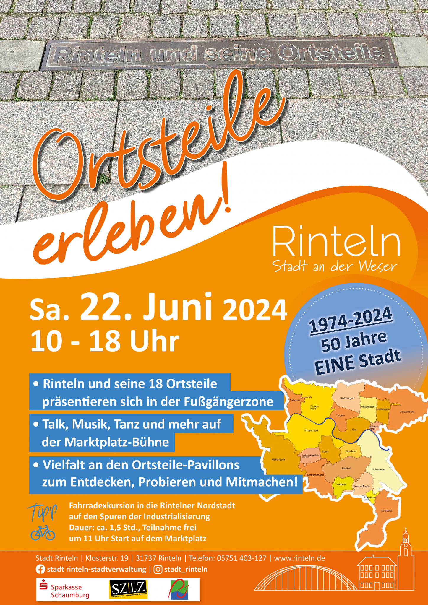 Vor 50 Jahren kam es zur Eingemeindung der insgesamt 18 Dörfer rund um die Stadt Rinteln zu einer Stadt. Anlässlich dieses Jubiläums feiert Rinteln zusammen mit seinen 18 Ortsteilen und Besuchern diese Gemeinschaft mit all ihrer Vielfalt aus Kultur, gelebtem Brauchtum, Traditionen, Tanz, Gesang, Historie, Natur und Vereinen in der Rintelner Fußgängerzone. In insgesamt zehn Pavillons zeigen Einheimische, was ihren Ortsteil lebens- und liebenswert macht. Anfassen, ausprobieren und schmecken: an den Ständen in der Weser- und Klosterstraße bieten die Ortsteile regionale Spezialitäten wie Butter, Honig, traditionelle Backwaren nach alten Rezepten, Obst und Getränke zur Verköstigung an. Viele Ehrenamtliche aus den Vereinen, Feuerwehren und Kirchengemeinden sowie Betrieben aus den 18 Ortsteilen präsentieren Besuchern und Einheimischen ein buntes Programm mit vielen Aktionen. Zusätzlich gibt es auf der Bühne einiges zu sehen und zu hören.