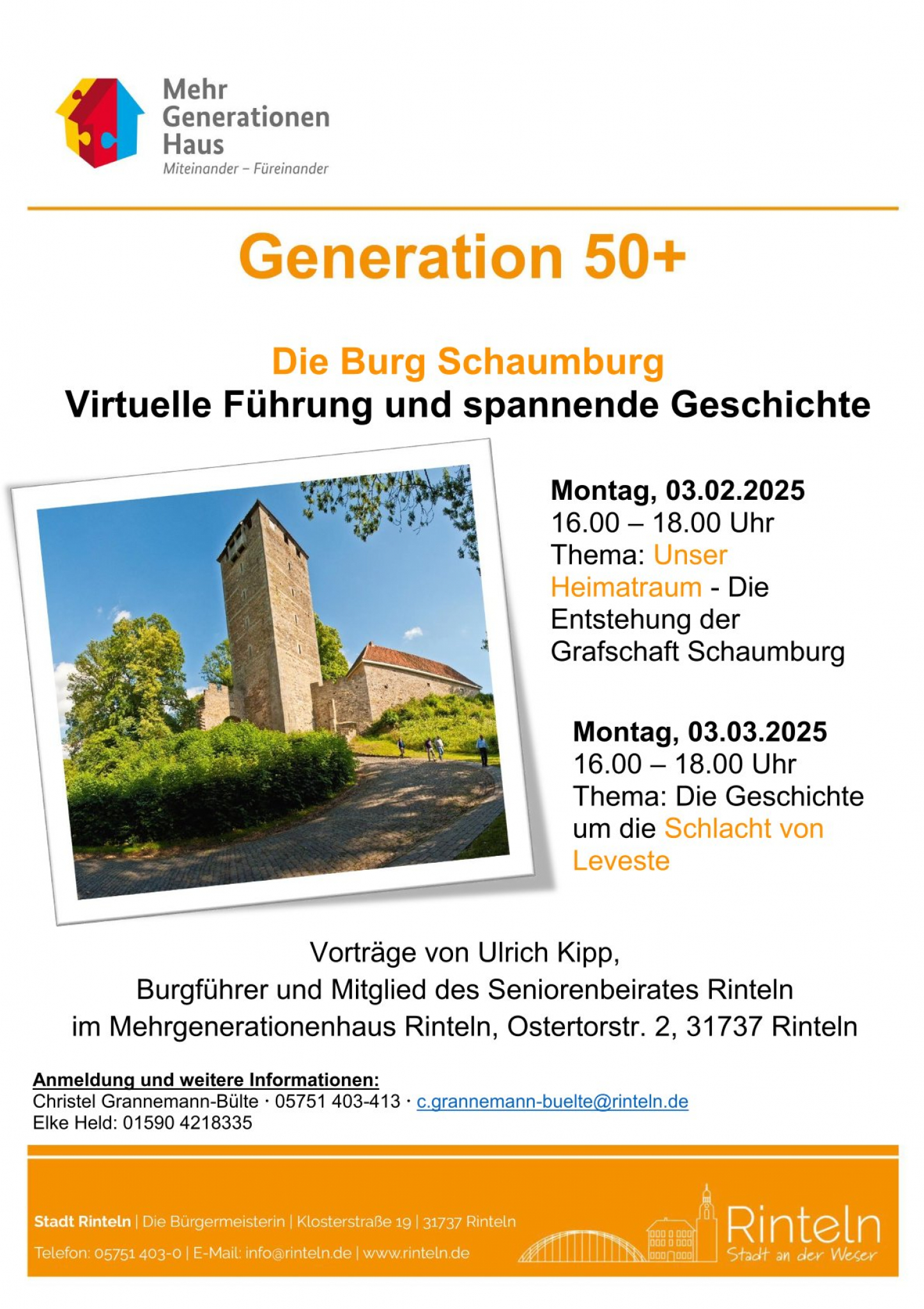 …dann kommt die Schaumburg zu Ihnen. Die Schaumburg thront auf dem Nesselberg und gab dem berühmten Grafengeschlecht und ihrem Land den Namen. Ulrich Kipp, Burgführer und Mitglied des Seniorenbeirates, präsentiert Ihnen an zwei Terminen eine virtuelle Führung durch die Schaumburg. Entdecken Sie die spannenden Geschichten, Mythen und Sagen rund um diese imposante Burganlage. Zusätzlich gibt es vielfältige Hintergrundinformationen zur Graftschaft Schaumburg.