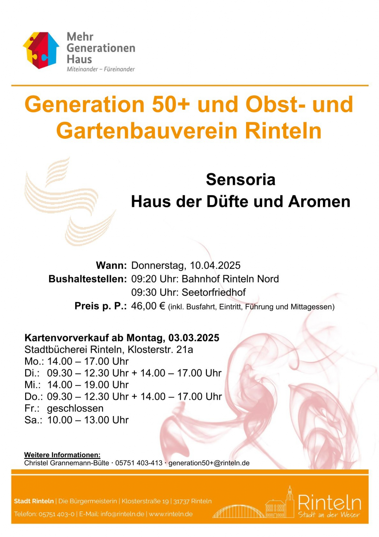 Der Obst- und Gartenbauverein Rinteln und die „Generation 50+“ des Mehrgenerationenhauses der Stadt Rinteln laden Sie ein auf einen Ausflug für die Sinne. Das „Sensoria“ zeigt die faszinierende Welt der Düfte und Aromen.
