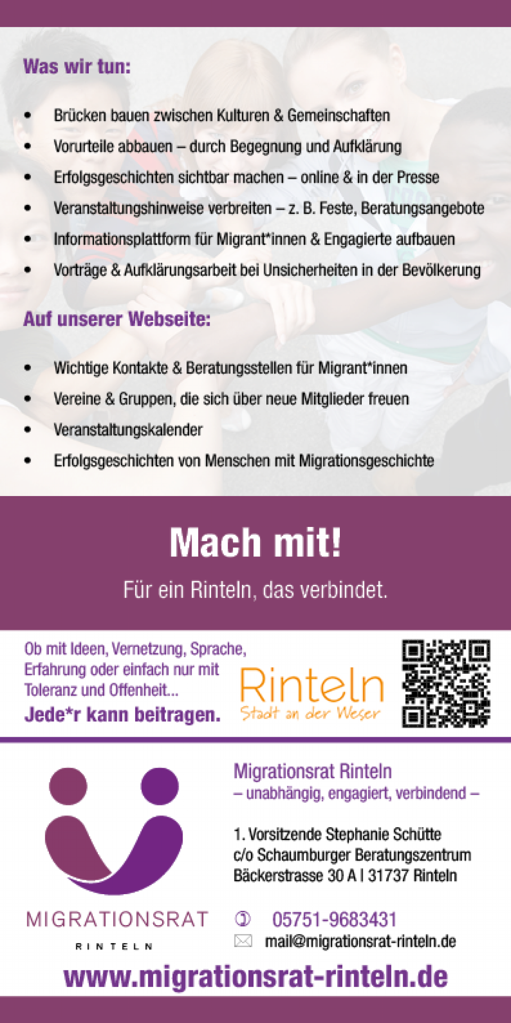 Als Interessenvertretung von Menschen mit Flucht- und Zuwanderungsgeschichte und um die Beziehungen unterschiedlicher Bevölkerungsgruppen zu fördern und den Dialog zwischen den Kulturen voranzubringen, möchte der Migrationsrat Rinteln das Leben in der Stadt mitgestalten!