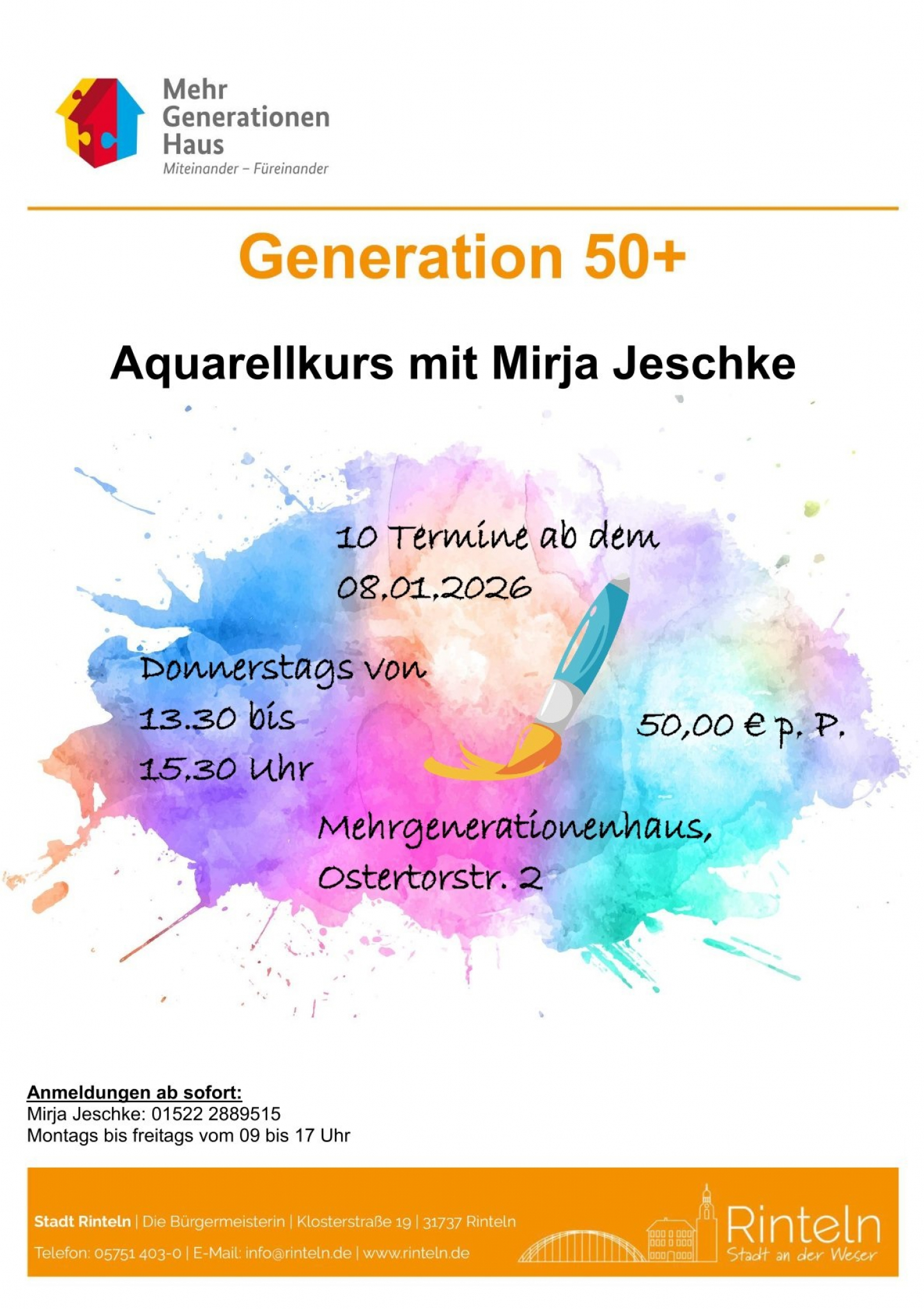 All das und vieles mehr bietet der Aquarellkurs für die „Generation 50+“, der am 08.01.2026 im Mehrgenerationenhaus Rinteln startet. Der Kurs richtet sich an alle, die Lust aufs Malen haben – Vorkenntnisse sind nicht erforderlich. Gestalten Sie Schritt für Schritt Ihre eigenen kleinen Kunstwerke.