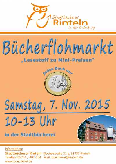Die Stadtbücherei Rinteln veranstaltet am Samstag, 07.11.2015, wieder einen großen Bücherflohmarkt im Mehrzweckraum der Eulenburg in der Klosterstraße 21 a. In der Zeit von 10 bis 13 Uhr kann nach Herzenslust nach alten und neuen Schätzen gestöbert werden.