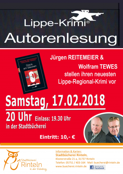 Am Samstag, 17. Februar 2018, stellen die Autoren Jürgen Reitemeier und Wolfram Tewes in der Stadtbücherei Rinteln ihren neuen Lippe-Krimi vor. Ein echter Leckerbissen - nicht nur für Krimi-Fans oder Freunde regionaler Literatur!