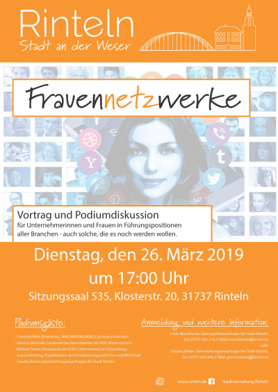 Die Stadt Rinteln lädt Unternehmerinnen und Frauen in Führungspositionen aus allen Branchen – auch solche, die es noch werden wollen – zu einem Vortrag mit anschließender Podiumsdiskussion zum Thema „Frauennetzwerke“ am