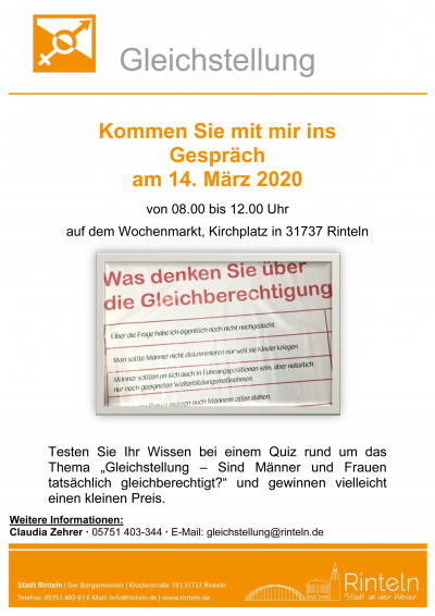 Besuchen Sie die Gleichstellungsbeauftragte auf dem Wochenmarkt am Samstag, den 14.03.2020 von 8 Uhr bis 12 Uhr.