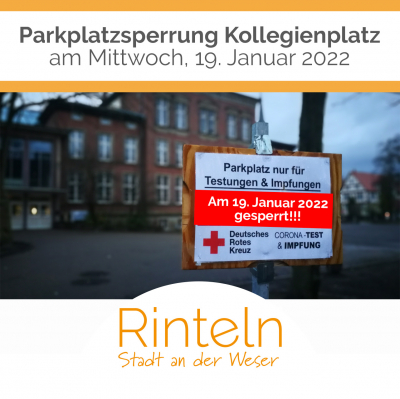 Aus organisatorischen Gründen steht am Mittwoch, 19. Januar 2022 die Parkplatzfläche (ehemaliger Schulhof der IGS) auf dem Kollegienplatz für Besucherinnen und Besucher der Impf- und Teststation des DRK Kreisverbandes Schaumburg e.V. nicht zur Verfügung.
