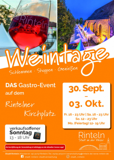 Nach zwei Jahren Pause dürfen sich die Besucherinnen und Besucher endlich wieder auf ein kulinarisches Fest der Rintelner Gastronomie freuen. Exzellente Spitzenweine und internationale Gaumenfreuden werden in stilvollen Pagodenzelte auf dem Kirchplatz angeboten. Aufgrund des günstig fallenden Feiertages wird sich das Fest dieses Jahr über vier Tage erstrecken.