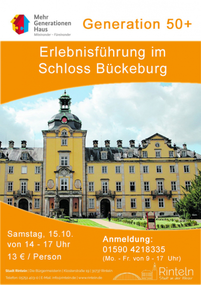 Am Samstag, den 15.10.2022 geht es von 14 – 17 Uhr für die „Generation 50+“ nach Bückeburg zu einer Schlossführung mit anschließendem Kaffee und Kuchen in der Schlossküche.