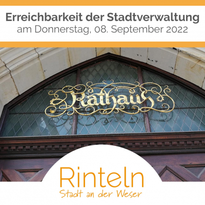 Wegen einer Personal- und Betriebsveranstaltung sind am Donnerstag, dem 08. September 2022, die Dienststellen und Ämter der Stadtverwaltung Rinteln nicht oder nur eingeschränkt erreichbar. In dringenden Angelegenheiten kann das Bürgerbüro an diesem Tag bis 12.30 Uhr kontaktiert werden. Die Bücherei ist geöffnet.