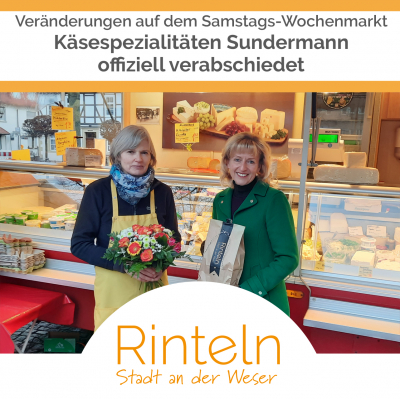 Über 40 Jahre lang hat Kerstin Sundermann aus dem Kalletal die Kundinnen und Kunden des Samstags-Wochenmarktes mit einer großen Auswahl an frischen und ausgefallenen Käsespezialitäten versorgt. Heute nahm sie aus persönlichen Gründen zum letzten Mal ihren Standplatz auf dem Rintelner Kirchplatz ein.