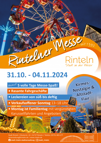 Vom 31. Oktober bis 06. November 2024 geht es in Rinteln an der Weser wieder hoch her. Die traditionelle Herbstmesse verspricht, in diesem Jahr bereits ab Donnerstag, fünf Tage voller Spaß, Spannung und Unterhaltung inmitten der historischen Altstadt.
