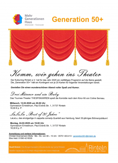 Der Kulturring Rinteln e.V. hat für das Jahr 2025 ein vielfältiges Programm auf die Beine gestellt. Die „Generation 50+“ hält ein Kontingent von je 20 Karten für folgende Veranstaltungen bereit.