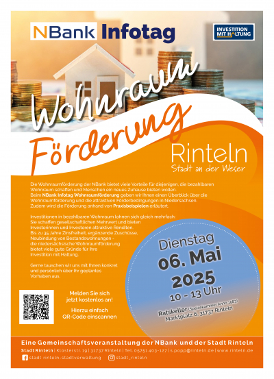 Am Dienstag, den 06. Mai 2025 von 10:00 bis 13:00 Uhr lädt die NBank gemeinsam mit der Stadt Rinteln zum Infotag ein.