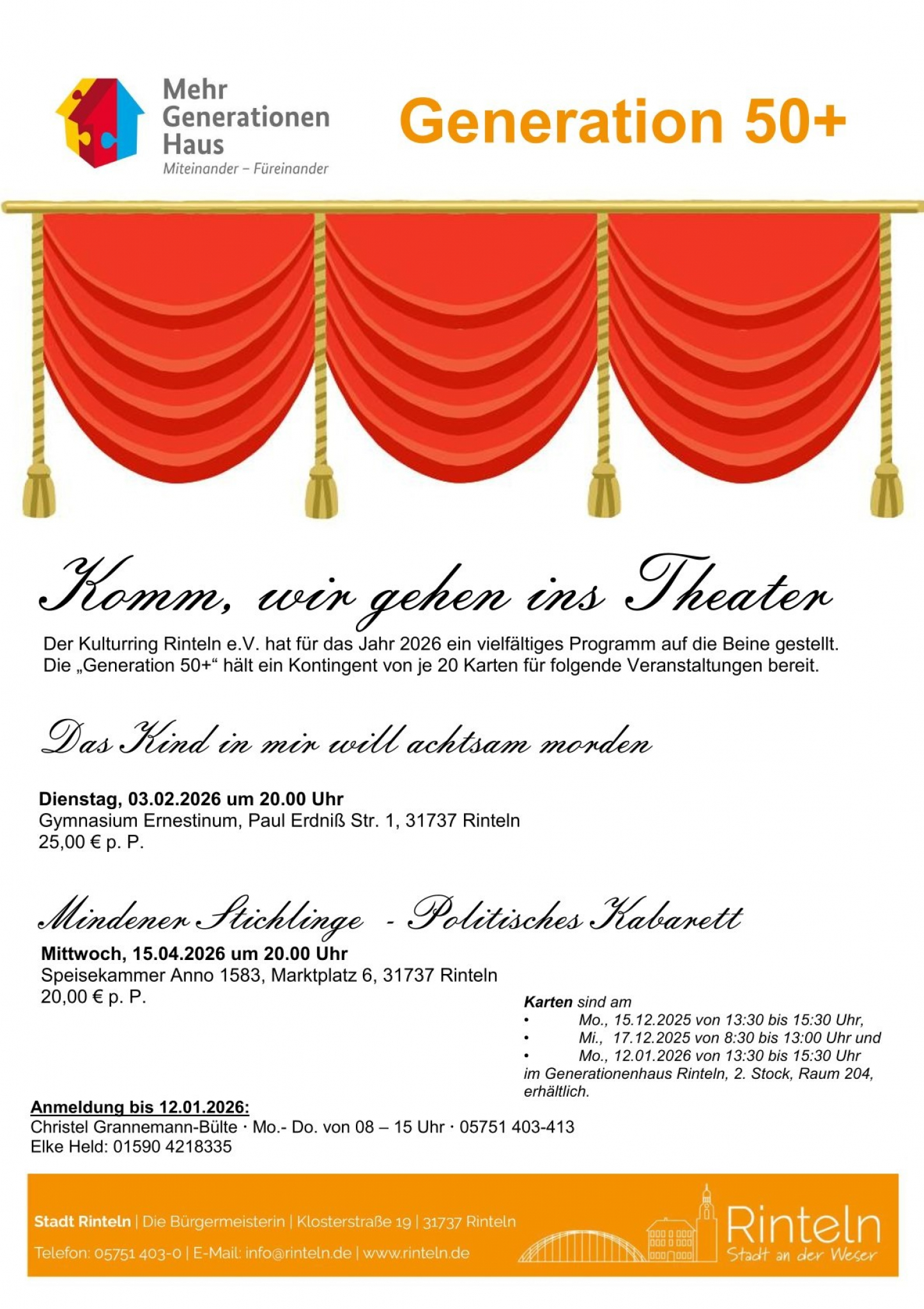 Der Kulturring Rinteln e.V. hat für das Jahr 2026 ein vielfältiges Programm auf die Beine gestellt. Die „Generation 50+“ hält ein Kontingent von je 20 Karten für folgende Veranstaltungen bereit.